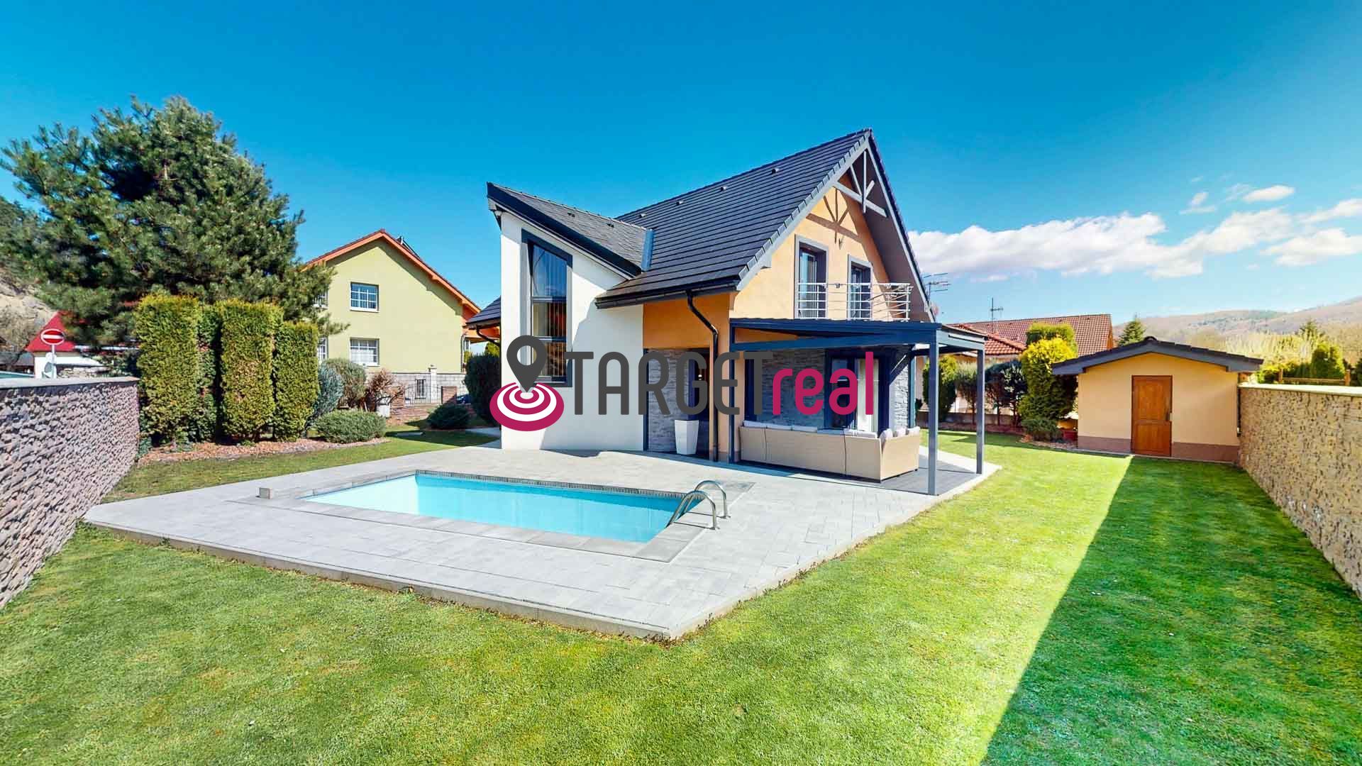 Exteriér domu tvorí pekne upravená a udržiavaná záhrada so záhradným sedením a bazénom, ktorá ponúka ideálny priestor na relax, oddych aj rodinné aktivity počas celého leta.