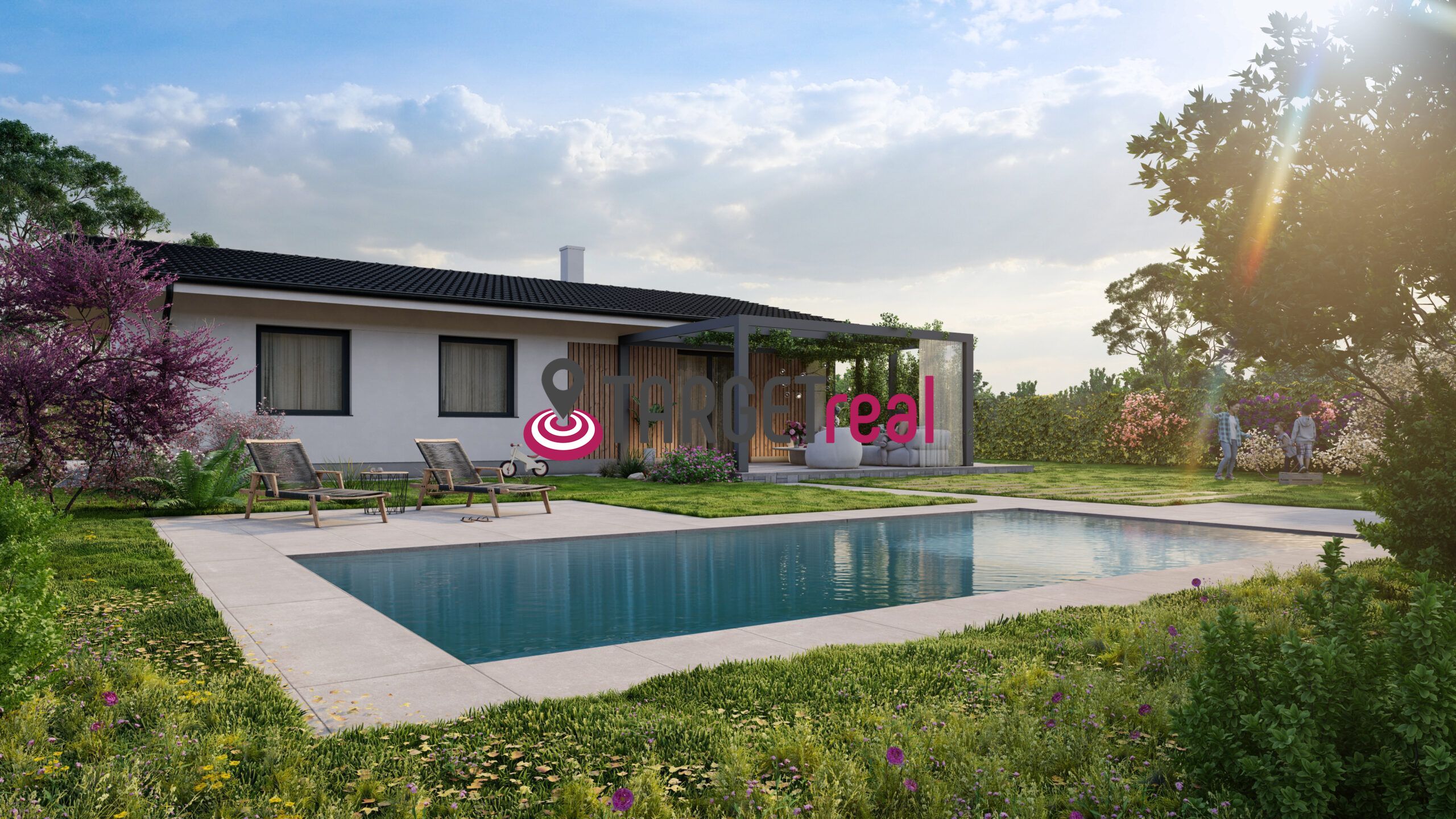Priestranná obývacia izba prepojená s kuchyňou tvorí spoločenské centrum domu. K nej patrí samostatná kuchyňa s dostatkom miesta na varenie aj jedálenský kút. Nočná časť ponúka tri plnohodnotné izby: hlavnú spálňu so šatníkom, detskú izbu a pracovňu, ktorá poslúži aj ako hosťovská izba. Súčasťou dispozície je aj kúpeľňa, samostatné WC, chodba a zádverie pri vstupe. Z obývacej časti je prístup na krytú terasu s výhľadom do zelene.